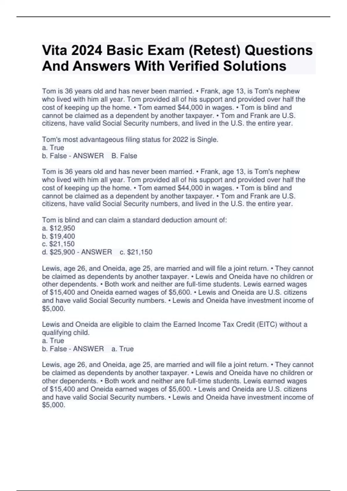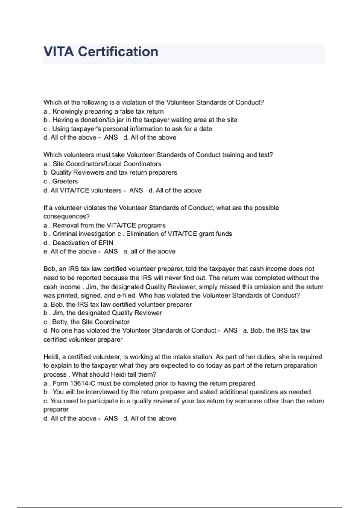 This document contains vita certification test questions and answers | latest 2024 to ensure quality service and accurate return preparation,. Vita/tce volunteer assistor’s test/retest volunteer income tax assistance (vita) / tax counseling for the elderly (tce) 2023 returns take your vita/tce.